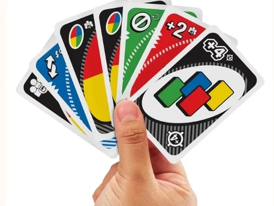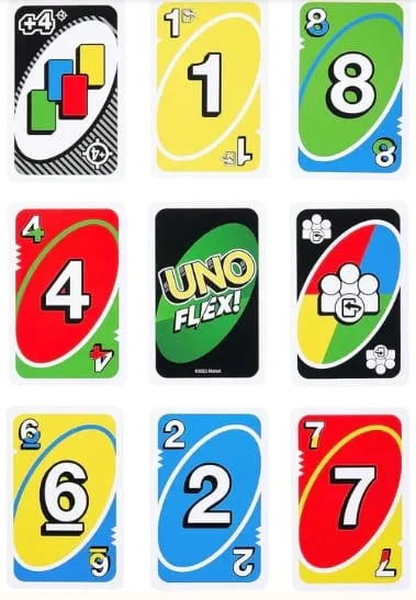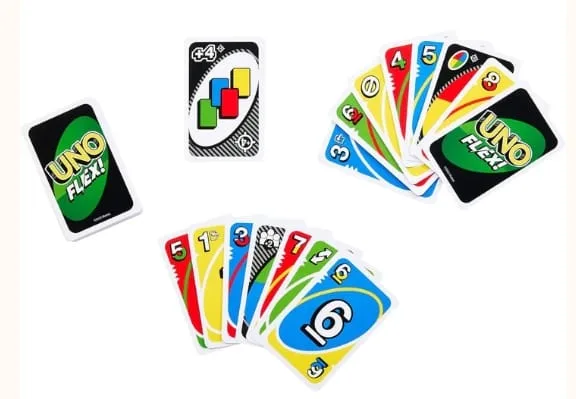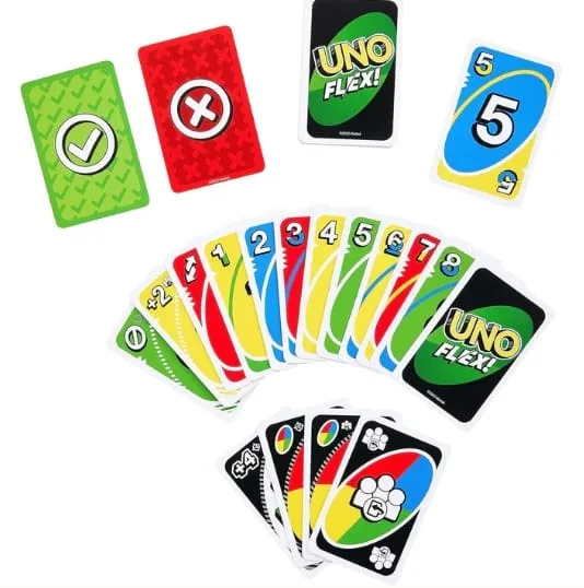 Play follows the classic Uno format—match colors or numbers to discard cards—but Flex Action cards let you change the rules! Use these cards to block penalties, reverse moves, or create your own gameplay strategies. Be the first to get rid of your hand and score points, but don’t forget to shout “UNO!” before your final card.